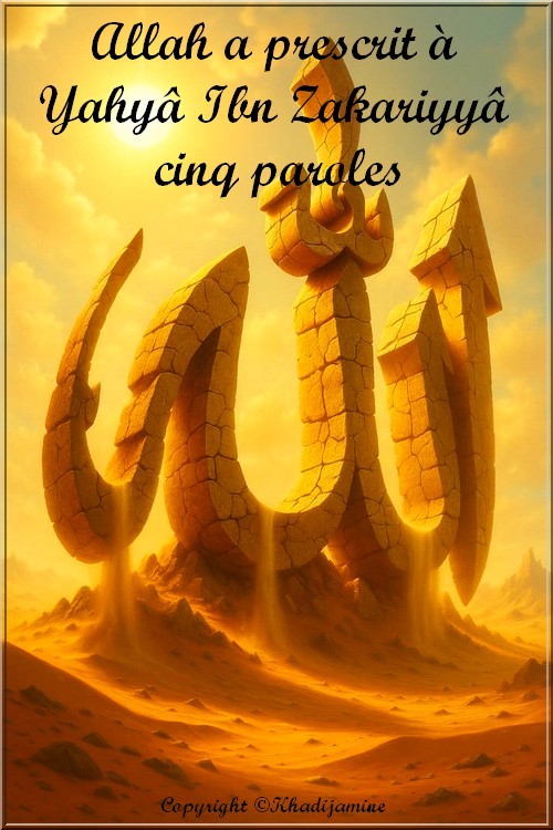 Abû Hurayra (qu’Allah soit satisfait de lui) rapporte que le Prophète ﷺ a dit : Certes Allah a prescrit à Yahyâ Ibn Zakariyyâ cinq paroles et lui a ordonné de les appliquer et de les faire appliquer aux Enfants d’Israël. Mais voyant que Yahyâ tardait à transmettre ses paroles, Allah révéla à Jésus :