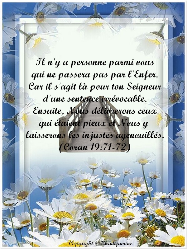Moi je dor a licouranniL'intelligence a été donné à l'homme pour le discernement.il ya des gens qui aiment les débats initiale.la sourate est claire pour celui qui veut sauver son âme.elle dit:il n'y a personne parmi vous qui ne passera pas par le feu de l'enfer,il s'agit là de ton seigneur d'une sentence irrévocable,puis nous délivrons ceux qui sont pieux et garder les mécréants dans le feu.quand on a l'intelligence obscurci on ne peu pas comprendre cette sourate.beaucoup rac ce que la sourate n'a pas dit pas motif de conscience.il ta seulement deux mots qui explique clairement la sourate.par et délivré.par veut dire a travers,et délivré veut dire libérer.si réellement il s'agissait d un pont que les croyants et les mécréants devraient traverser on ne parlera de délivrance des croyants.un pont sert de passage de un côté a un autres.c'est pas un lieu de stationnement.passer par,passer a travers.on ne parle pas pont.ceux qui aiment les débats inutile peuvent continuer.Je ne comprends absolument pas comment des chrétiens on put ce retrouver dans les commentaires dédié aux musulmans. L’ont croirait que certains passent leurs temps à vouloir crier Jesus partout.Jésus-christ est le fils de DIEU !
