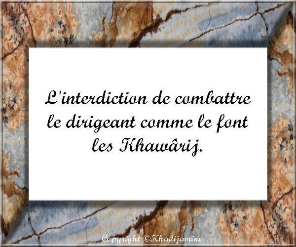" Combattre le dirigeant ne pas partie de la Sunna ". C'est à dire qu'il n'existe aucune preuve authentique ou faible qui permette de combattre le dirigeant Musulman. Au contraire, il s'y trouve ainsi que dans le Coran, l'ordre de lui obéir.
