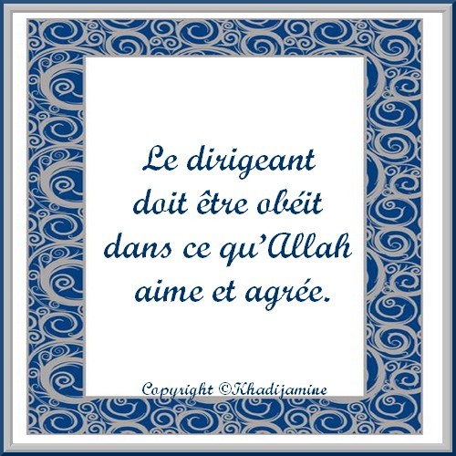(Rapporté par Bukhâri dans son Sahîh 4/1577, n°4085) et Muslim 3/1469, n°1840, du hadith de Alî, la formulation de Muslim est : " Pas d’obéissance dans la désobéissance à Allah, l’obéissance n’est que dans le bien ")