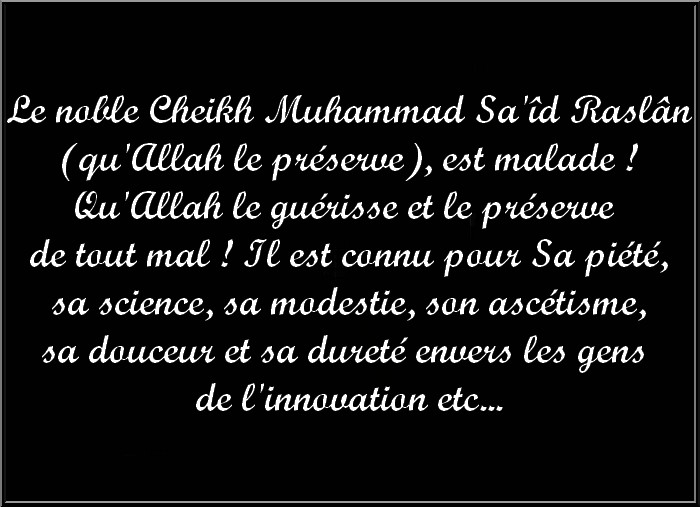 Le noble Cheikh Muhammad Sa'îd Raslân (qu'Allah le préserve), est malade !