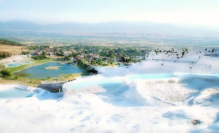 Pamukale est un site naturel et touristique de Turquie composé de sources formant une tufière ce qui donne à la montagne une apparence de forteresse de coton ou d’une chute d’eau gelée.