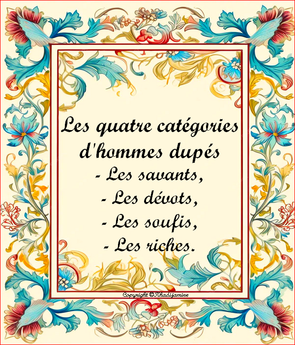 La première catégorie est celle des savants : Qui sont eux-mêmes de plusieurs groupes. Certains maîtrisent les sciences religieuses et rationnelles, mais négligent d'inspecter leurs membres, de les préserver des péchés et de leur imposer les adorations. Ils sont trompés par leur science et pensent occuper un rang auprès d'Allah. Mais s'ils observaient avec l'œil du discernement, ils sauraient que la science de la relation à Allah ne vise que la pratique sans laquelle elle n'aurait aucune valeur. Allah ﷻ dit :
