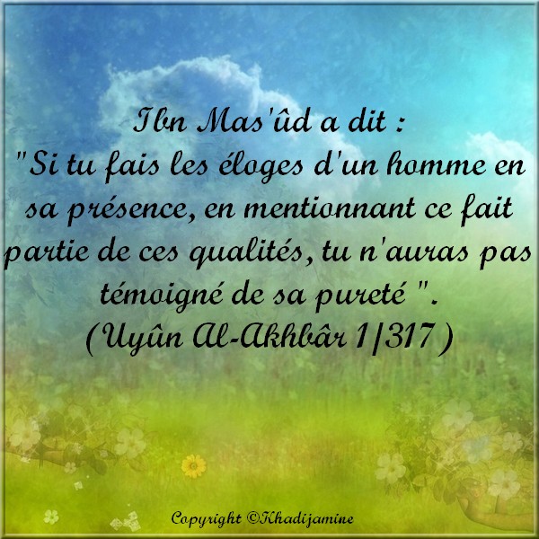 Il répondit : " Ô Fath ! A une vie meilleure que la mienne l'homme qui possède une vaste maison, une épouse pieuse, sa subsistance, qui ne nous connait pas si bien que nous ne pouvons lui nuire, et qui n'a pas besoin de nous, si bien que nous ne pouvons le rabaisser ".