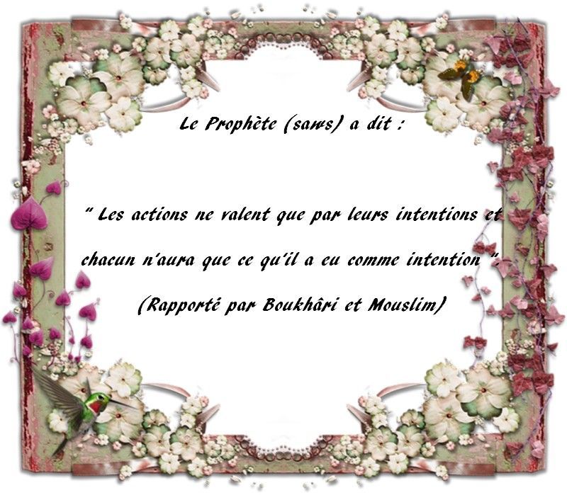 " Votre Seigneur, le Très-Haut et glorifié, est très miséricordieux. Si quelqu'un a l'intention de faire une bonne action mais n'est pas en mesure de la réaliser, Dieu la lui inscrit comme une bonne action. S'il l'exécute, Dieu lui inscrit pour elle une bonne action multipliée de dix à sept cents fois et davantage encore. S'il a l'intention de commettre une mauvaise action et qu'il ne la fait pas, Dieu la lui inscrit comme une bonne action. Et s'il exécute la mauvaise action, Dieu la lui inscrit comme une seule mauvaise action, ou alors Il l'efface.