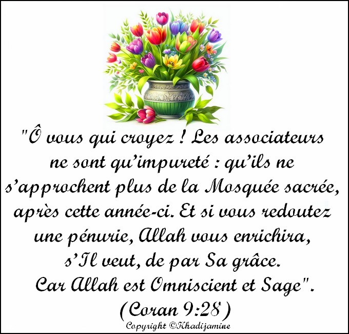 " C'est Lui qui a envoyé Son Messager avec la bonne direction et la religion de la vérité, afin qu'elle triomphe sur toute autre religion, quelque répulsion qu'en aient les associants ".