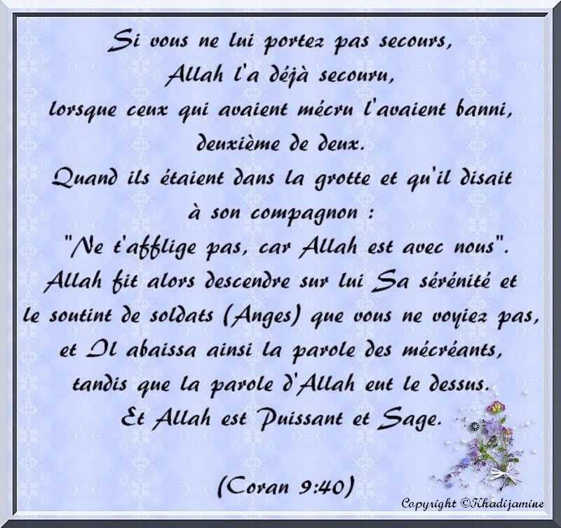 " Si l'un d'eux avait l'idée de regarder sous ses pieds, il nous verrait. Ô Abû Bakr, répondit-il, que penses-tu qu'il puisse arriver à deux personnes qui ont avec elles Allah comme troisième ? "