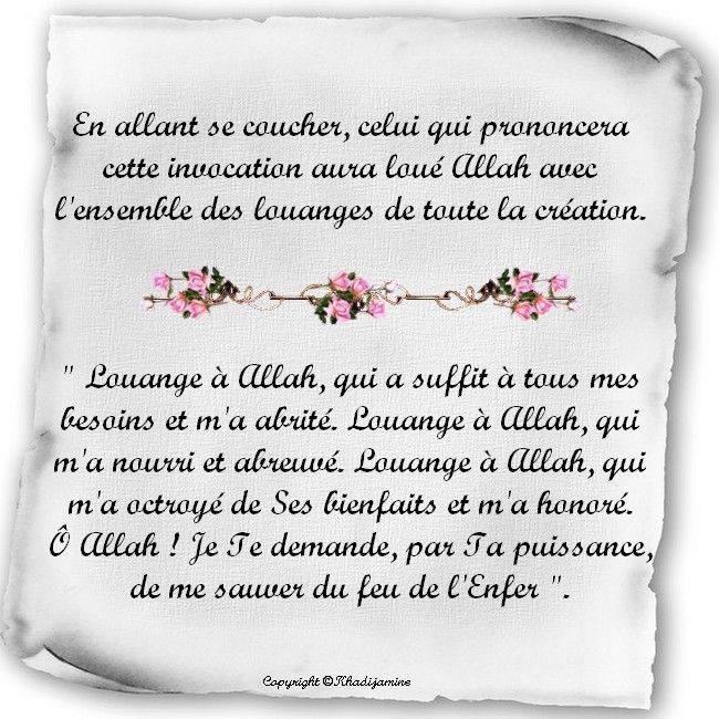 En allant se coucher, celui qui prononcera cette invocation aura loué Allah avec l'ensemble des louanges de toute la création.